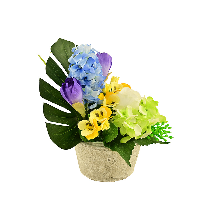Kunstbloemstuk in ronde stenen pot met krokus, hyacint, viooltjes, hortensia en bessen