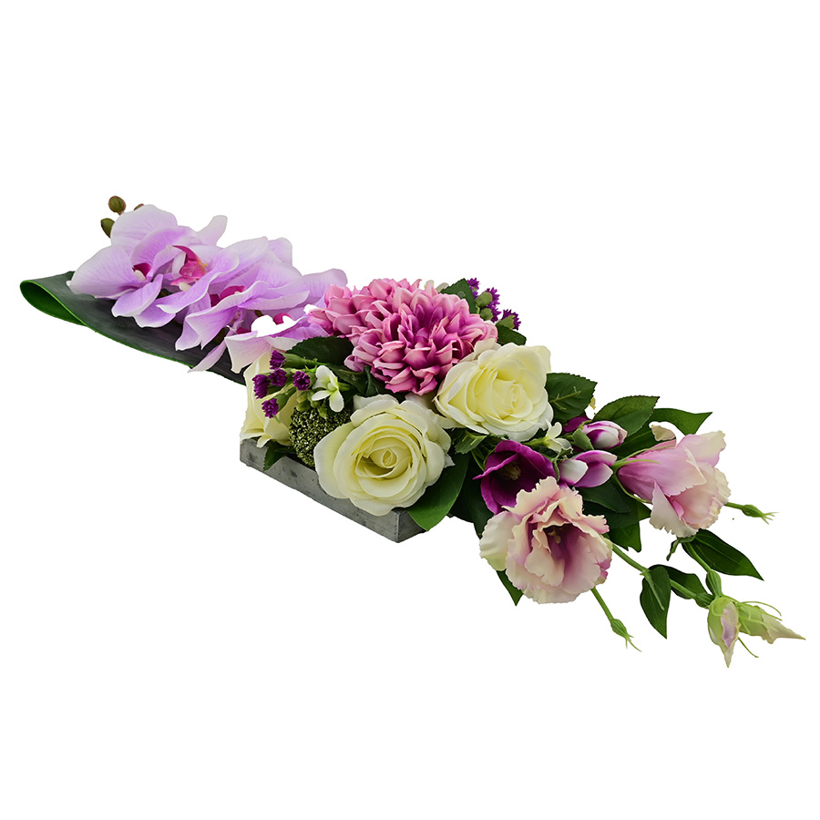 Kunstbloemstuk open rozen phalaenopsis dahlia eustomia vulling