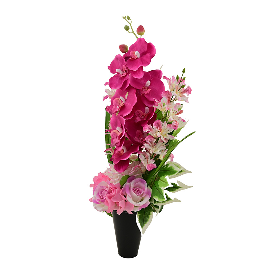 Grafvaas in plastic pot bestaande uit ficus tak dahlia phalaenopsis open rozen 2 x orchidee